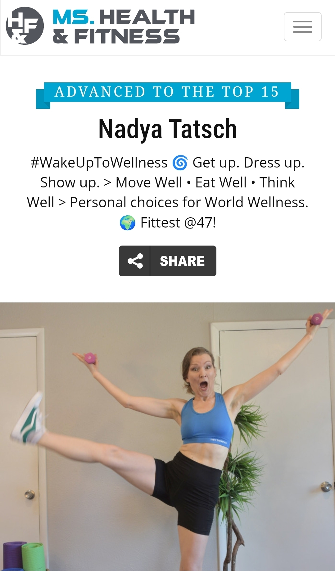 My whole purpose for entering the Health and Fitness Competition is to raise awareness for this message: Wake up to Wellness. Get up, Dress up, Show up—you can look and feel good at any age.